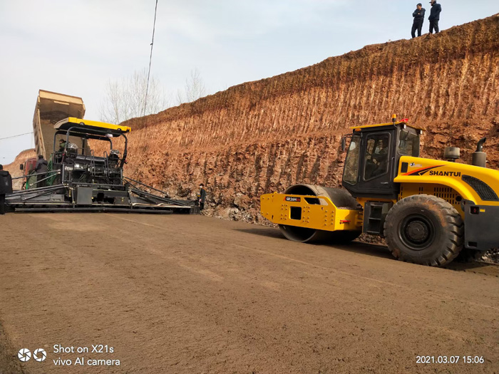 山推SRP12-C5 MA攤鋪機(jī)與SR26H-C5壓路機(jī)完美配合,助力河南某道路水穩(wěn)基層建設(shè),施工寬度10m,作業(yè)厚度230mm,連續(xù)三層施工作業(yè),高效,高質(zhì)量施工,獲得客戶的一致好評(píng)。