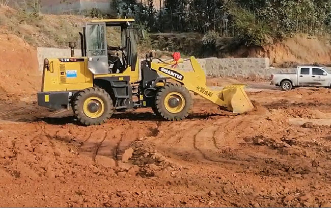 某廠房建筑工地進行土方鏟裝,地面平整作業(yè),整機靈活性高,油耗低,燃油經(jīng)濟性好,工作效率高。
