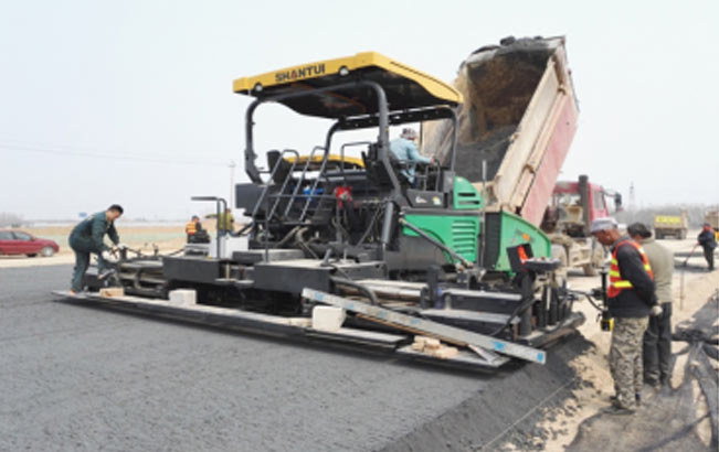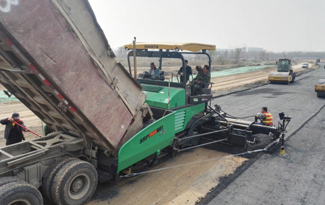 2019年3月,山推攤鋪機、壓路機參與省內某市政公路工程建設,并負責水穩(wěn)層以及面層施工。在施工過程中采用SRP90S-PLUS、SRP95M-PLUS雙機連鋪,超高效率完成攤鋪作業(yè),縮短施工工期,并贏得施工方與客戶的高度認可。