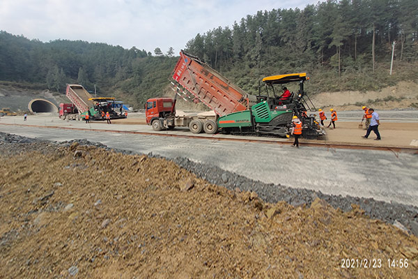 山推SRP09-C5 MA攤鋪機,雙機聯(lián)鋪助力貴州某高速道路建設,施工路段約30公里,作業(yè)寬度為12m,作業(yè)厚度300mm,作業(yè)速度快,施工質量高,獲得監(jiān)理的的一致好評。